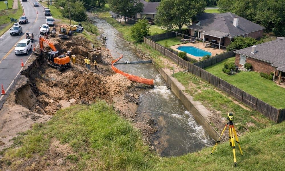 Roadside emergency drainage repair and survey setup Published February 13, 2026 at 1000 × 600 in How an ALTA Land Survey Protects You From Easement Surprises