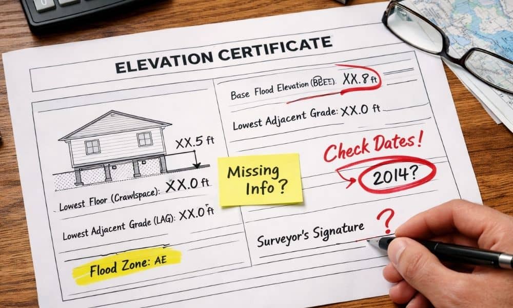 Insurance underwriter reviewing survey document Published February 9, 2026 at 1000 × 600 in What Insurance Companies Look for on Elevation Certificate